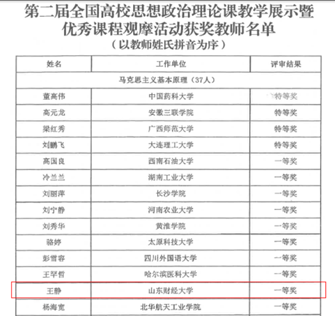 近日,教育部社会科学司发布《关于第二届全国高校思想政治理论课教学展示暨优秀课程观摩活动的评审结果》通知,我校马克思主义学院青年教师王静榜上有名,成为山东省在此次比赛中首次荣获“马克思主义基本原理”课程教学展示一等奖奖项的教师。