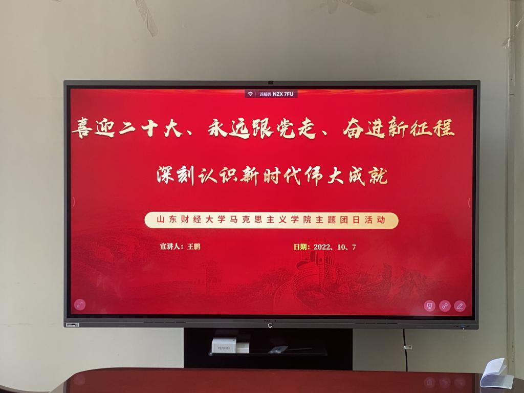 为庆祝中华人民共和国成立73周年,迎接党的二十大胜利召开,团结引领广大青年坚定跟党走,10月7日下午,马克思主义学院于图书馆606会议室开展了“喜迎二十大、永远跟党走、奋进新征程”主题教育实践活动中的“深刻认识新时代伟大成就”专题学习。此次活动由2021级团支书王鹏同学主持,马克思主义学院2021级团支部委员、2022级全体团员参加。