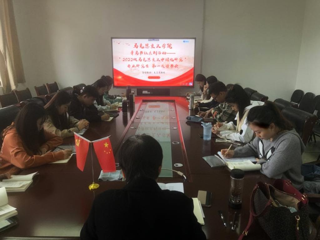 在党的二十大即将召开之际,为了加强党史学习教育,提升青年学生的马克思主义理论素养,10月6日下午,马克思主义学院青马书社于图书馆606会议室开展了2022级马克思主义中国化研究专业研究生读书会。本期所读篇目是《毛泽东选集》第一卷中的《中国的红色政权为什么能够存在?》《井冈山的斗争》《星星之火,可以燎原》《反对本本主义》四篇文章,毛玉美教授为本期读书会导读老师。本次读书会主要分为学生分享、自由讨论与教师讲解答疑三个环节进行。
