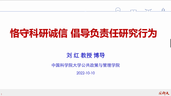 为帮助研究生掌握科研规范,10月10日晚,马克思主义学院组织研究生集体观看了中国科学院大学刘红教授“恪守科研诚信 倡导负责任研究行为”的线上直播讲座。