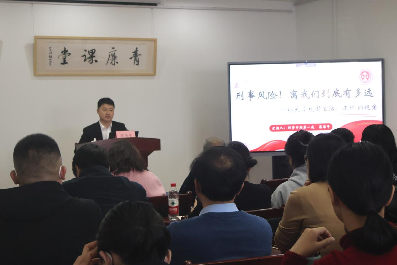 为加强师生法治教育,提升师生法治意识,2023年12月8日下午,山东省高级人民法院刑一庭副庭长、三级高级法官蒋海年应我院邀请,在图书馆616青廉课堂开展《刑事风险!离我们到底有多远——以大学校园生活、工作的视角》专题讲座。讲座由山东财经大学纪委常务副书记王剑主持,校纪委、监察专员办公室全体干部、各基层党委纪检委员、校团委“青马工程”学员、马克思主义学院教师、学生代表共同聆听了讲座。