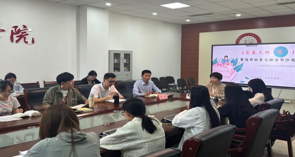 为深入学习贯彻习近平文化思想和习近平总书记关于青年工作的重要思想,积极响应团中央基层建设部、全国学联秘书处倡导的“为中国式现代化挺膺担当——青春年少好读书”2024年主题读书季活动,5月10日下午,山东财经大学马克思主义学院在图书馆606会议室举办了以“中国式现代化与当代青年的责任”为主题的读书沙龙活动。活动由青马书社指导教师张建主持,邀请毛玉美教授领读,马克思主义学院2022和2023级研究生参加。